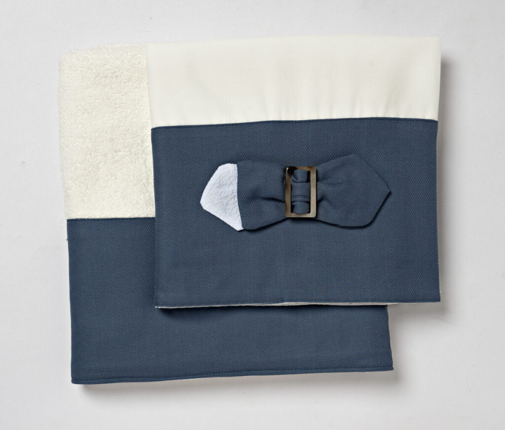 Βαμβακερά λαδόπανα σε ιβουάρ χρώμα με φάσα σε μπλε ραφ απόχρωση και ιδιαίτερο στόλισμα με διπλό φιόγκο. Τα λαδόπανα περιλαμβάνουν μεγάλη πετσέτα και σεντόνι, πετσέτα μικρή και εσώρουχα.