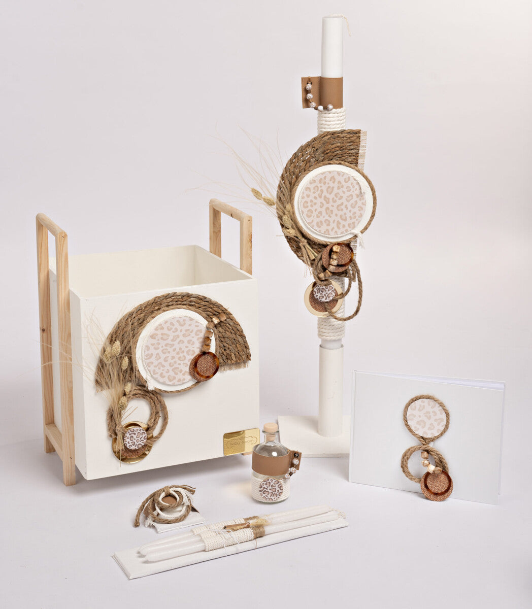 Ένα μοντέρνο βαπτιστικό πακέτο με animal print στοιχεία που αποτελείται από ξύλινο κύβο, λαμπάδα και σετ λαδιού. Όλα είναι στολισμένα με στοιχεία της φύσης δέρμα ξύλο, χάντρες σε φυσικά χρώματα και μια σύνθεση από αγριολούλουδα. Μια ιδιαίτερη πρόταση από την Baby Bloom για μοντέρνους νονούς! Στο σετ περιλαμβάνεται σετ λαδιού.