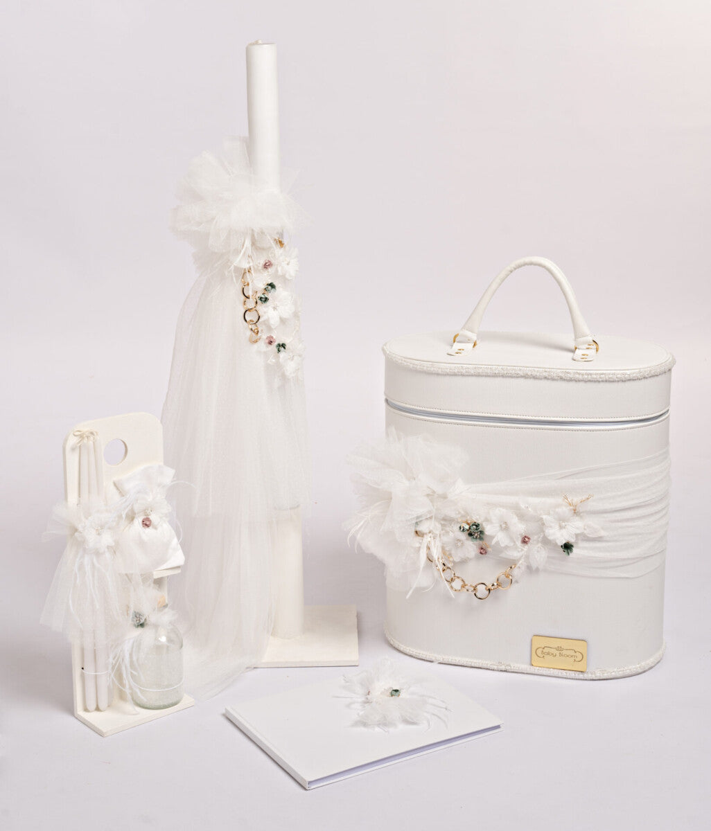 Ένα ρομαντικό πακέτο βάπτισης που αποτελείται από λευκή τσάντα δερματίνη με μια σύνθεση λευκών λουλουδιών και λεπτομέρειες από βεραμάν και σάπιο μήλο. Η χρυσή αλυσίδα πάνω στην σύνθεση της τσάντας αλλά και της λαμπάδας δίνουν στο σύνολο μια μοντέρνα πινελιά! Στο σετ περιλαμβάνεται σετ λαδιού και ευχολόγιο!