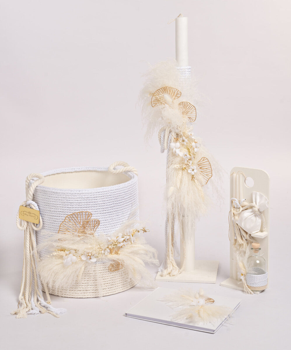 Ένα βαπτιστικό πακέτο που ξεχωρίζει! Η αρχοντιά του λευκού σε συνδυασμό με την λαμψη του χρυσού και η απλότητα του εκρού ολοκληρώνουν αρμονικά αυτή την επιλογή πακέτου! Ξύλινο στρογγυλό κουτί στολισμένο με pampas και μια εντυπωσιακή σύνθεση από τρισδιάστατα λουλούδια, και χάντρες ! λαμπάδα με πλούσιο στολισμό από την ίδια σύνθεση και φυσικά κορδόνια! Μπουκαλάκι λαδιού, κεράκια, σαπούνι και ευχολόγιό όλα αρμόνικα στολισμένα για την δική σας ξεχωριστή βάπτιση! Xρειάζεται ένα μίκρο χρόνο να κατασκευαστεί παρακαλώ επικοινωνήστε με το κατάστημα στα τηλεφώνα η μέσω email.