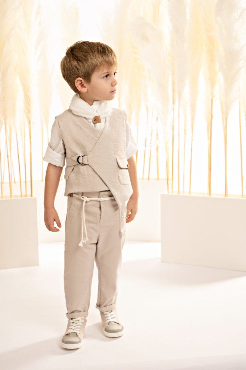 Αίσθηση κομψότητας με μοντέρνα στοιχεία που το καθιστούν εξαιρετικά όμορφο και σύγχρονο, αυτό το σύνολο αποτελείται από:  παντελόνι σε μπεζ ανοιχτό χρώμα, με ιδιαίτερα κοψίματα στο πλάι και εξωτερικές πίσω τσέπες από diagonal cotton-viscose ύφασμα και γιλέκο με λοξό ασύμμετρο κόψιμο και εξωτερικό τσεπάκι σε μπεζ γκοφρέ βαμβακερό ύφασμα. Το βαμβακερό πουκάμισο σε off white απόχρωση με Mao ιδιαίτερο γιακά δένει αρμονικά με το υπόλοιπο σύνολο, προσθέτοντας μια λεπτομέρεια που κάνει την διαφορά. Το φουλάρι από υφαντή γάζα και η ζώνη από λευκό κορδόνι ολοκληρώνουν ιδανικά το σύνολο, ενώ το ψάθινο καπέλο ή η τραγιάσκα (κατά επιλογή) προσφέρουν την τελευταία πινελιά στον αέρα. Ένα σύνολο που ισορροπεί τέλεια ανάμεσα στην άνεση και την κομψότητα!