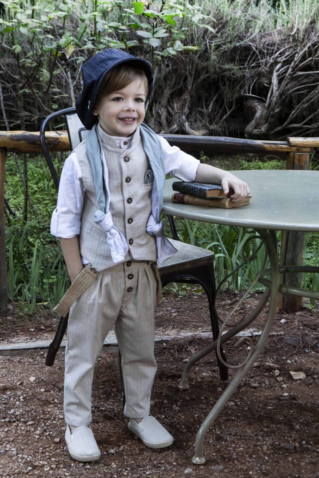 Ένα εντυπωσιακό σετ Baby Bloom της συλλογής Printemps 2023 σε απόχρωση μπεζ της άμμου. Γιλέκο ριγέ μπεζ με μάο γιακά, παντελόνι ριγέ με πιέτες και πουκάμισο λευκό λινό. Στο σετ περιλαμβάνονται επίσης τιράντες, δίχρωμο φουλάρι και ψάθινο καπέλο ή μπερές.