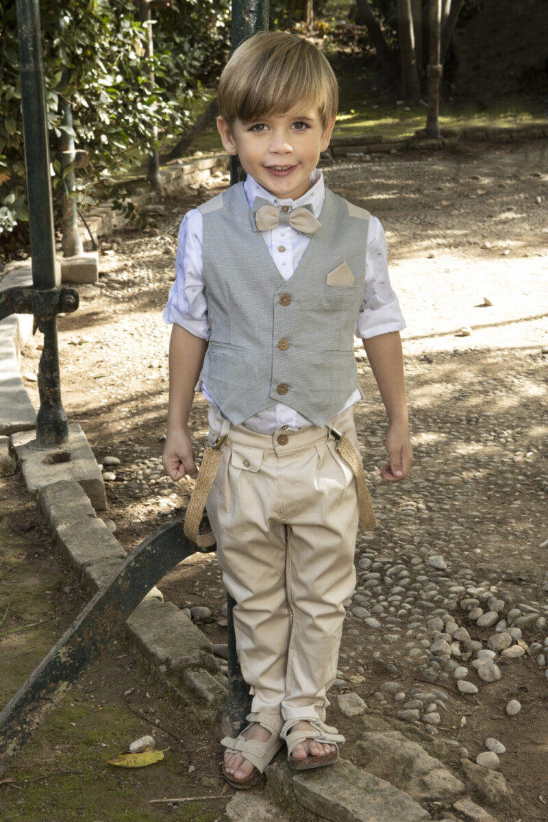 Ο πιο chic συνδυασμός βάπτισης σε αποχρώσεις βεραμάν και μπεζ, που περιλαμβάνει γιλέκο βεραμάν με διχρωμία μπεζ στην πλάτη, πουκάμισο λευκό με ιδιαίτερο print και παντελόνι μπεζ καπαρντίνα πιέτες. Στο σετ περιλαμβάνονται επίσης τιράντες, υφασμάτινο παπιγιόν και ψάθινο καπέλο ή μπερές.