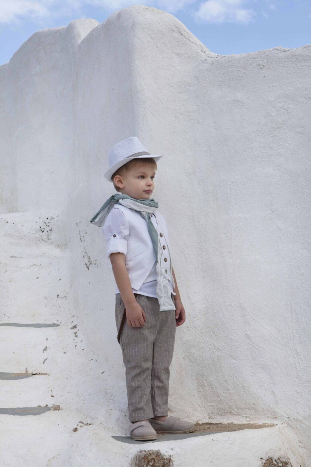 Μοντέρνο σετ βάπτισης 7 τεμαχίων σε αποχρώσεις λευκό και μπεζ της άμμου με βεραμάν λεπτομέρειες. Περιλαμβάνει γιλέκο λευκό λινό διπλό, πουκάμισο λευκό λινό και παντελόνι μπεζ ριγέ της άμμου με πιέτες και λοξό κούμπωμα. Στο σετ περιλαμβάνονται επίσης τιράντες, ξύλινο παπιγιόν, δίχρωμο φουλάρι και ψάθινο καπέλο ή μπερές.