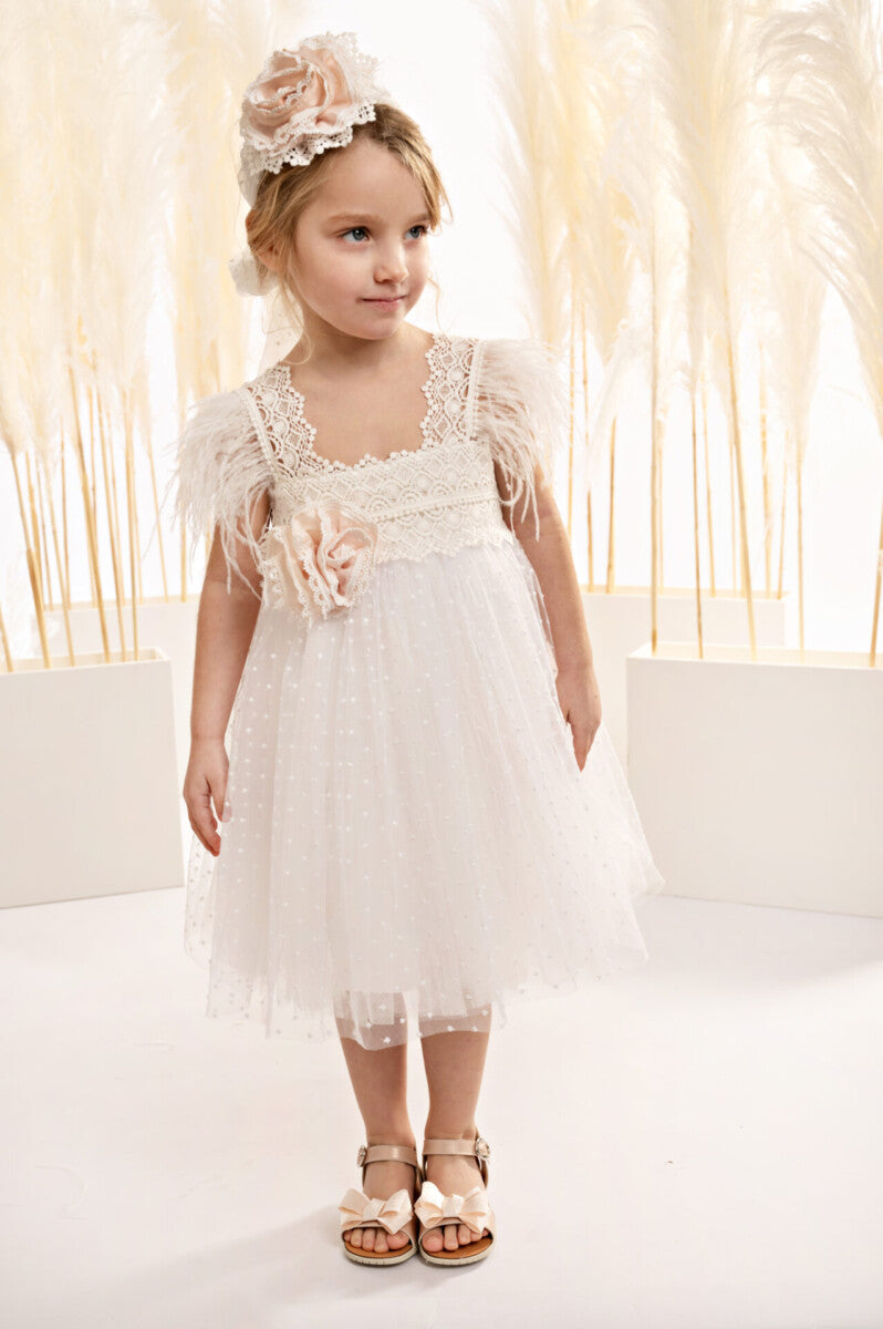 Ένα μοναδικό boho φόρεμα σε λευκό χρώμα με μπούστο από μακραμέ δαντέλα, με