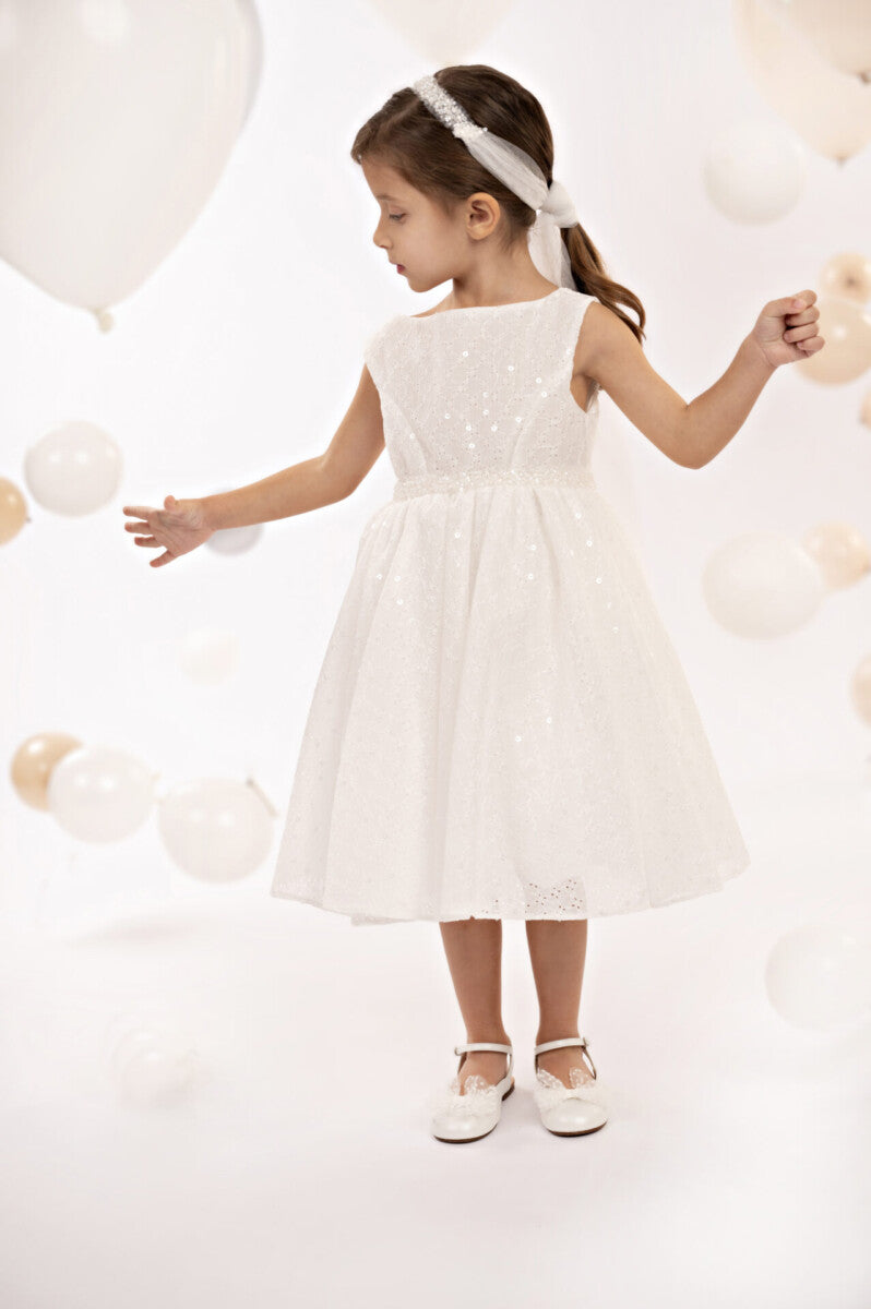 Ένα κομψό και διαχρονικό φόρεμα φτιαγμένο εξολοκλήρου από δαντέλα τύπου Broderie Anglaise, διακοσμημένο με διάφανες παγιέτες που χαρίζουν μια διακριτική λάμψη. Η λαιμόκοψη bateau προσδίδει αριστοκρατική φινέτσα, ενώ η πλάτη κλείνει με ντυτά κουμπάκια, προσθέτοντας μια ρετρό λεπτομέρεια. Η φούστα με σούρα δημιουργεί αέρινη κίνηση, ενώ η διακοσμητική τρέσα στη μέση, κεντημένη με χάντρες, παγιέτες και πέρλες, ολοκληρώνει το σχέδιο με έναν εκλεπτυσμένο τόνο λάμψης. Η κορδέλα για τα μαλλιά, διακοσμημένη με την ίδια τρέσα, συμπληρώνει αρμονικά το σύνολο. Όλα τα φορέματα διαθέτουν βαμβακερή φόδρα και φουρό.
